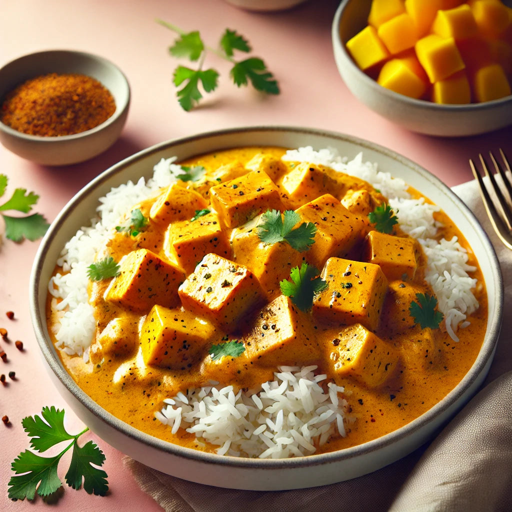 Golden tofu cubes in a sweet coconut curry sauce with jasmine rice.