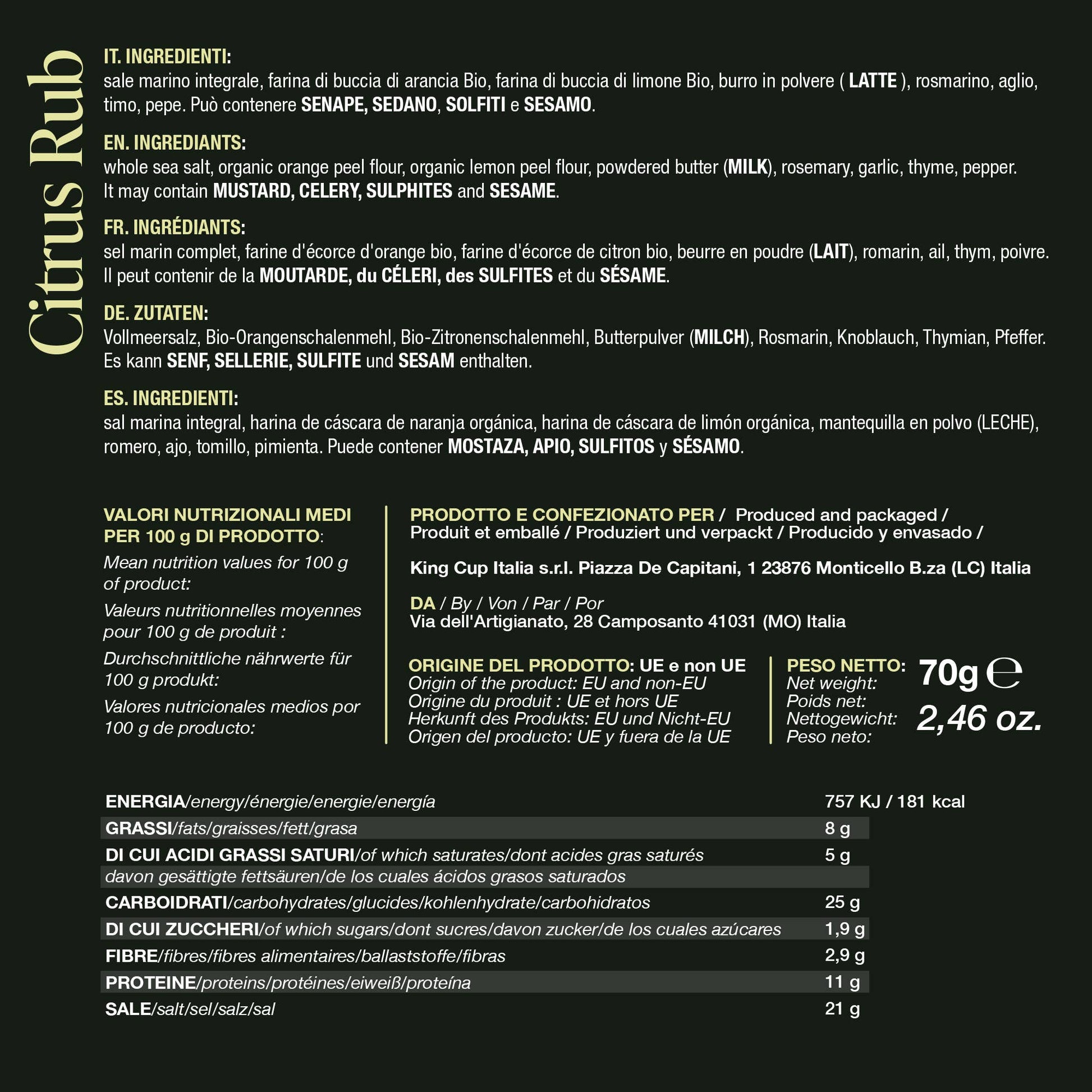 Citrus Rub is made of organic lemon and orange rind from Sicily, an instant fusion of sweet and sour.