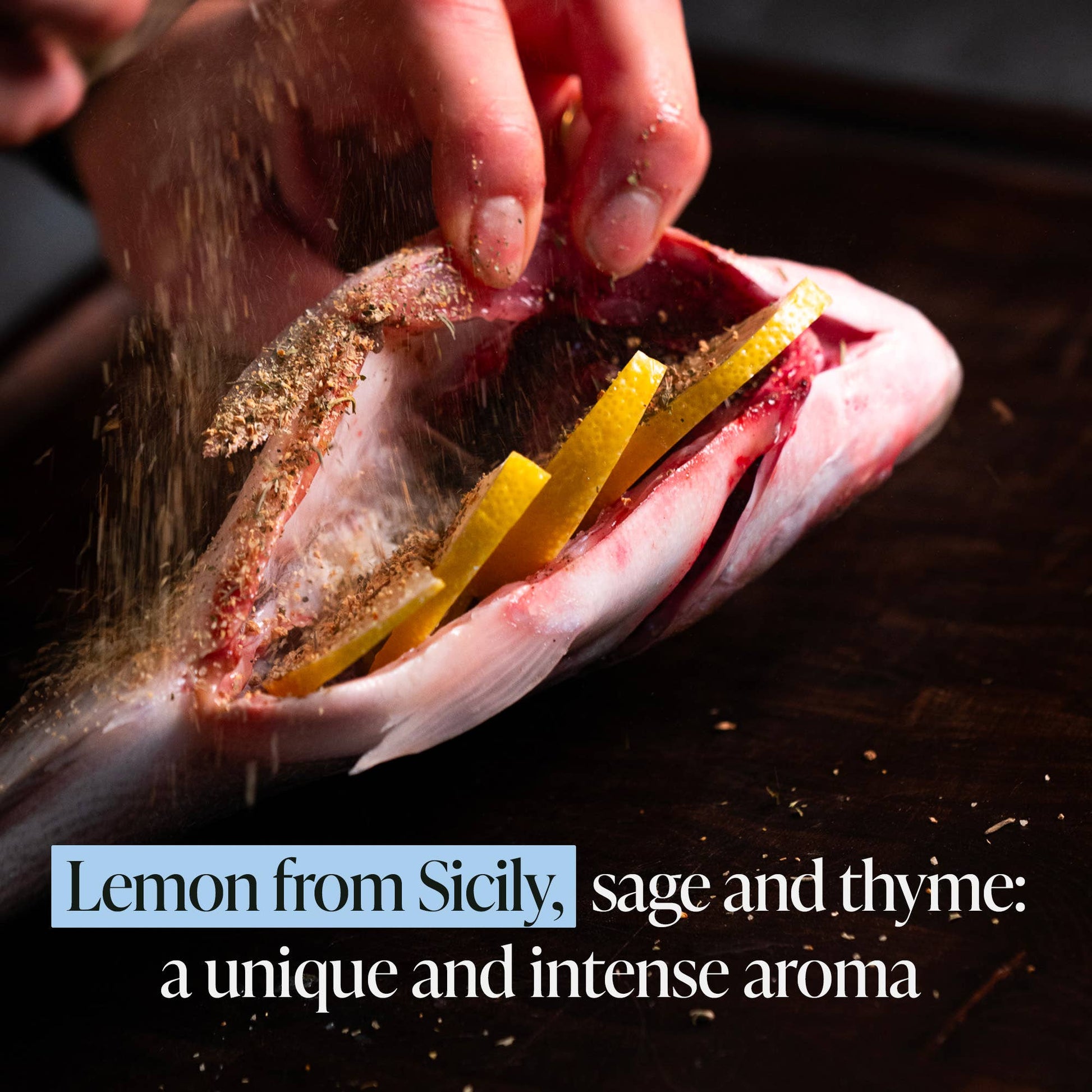 The freshness of organic lemon rind from Sicily combines with the lightness of thyme and sage: a perfect trio of tastes that gives flavour to salmon fillets, white fish and shellfish.