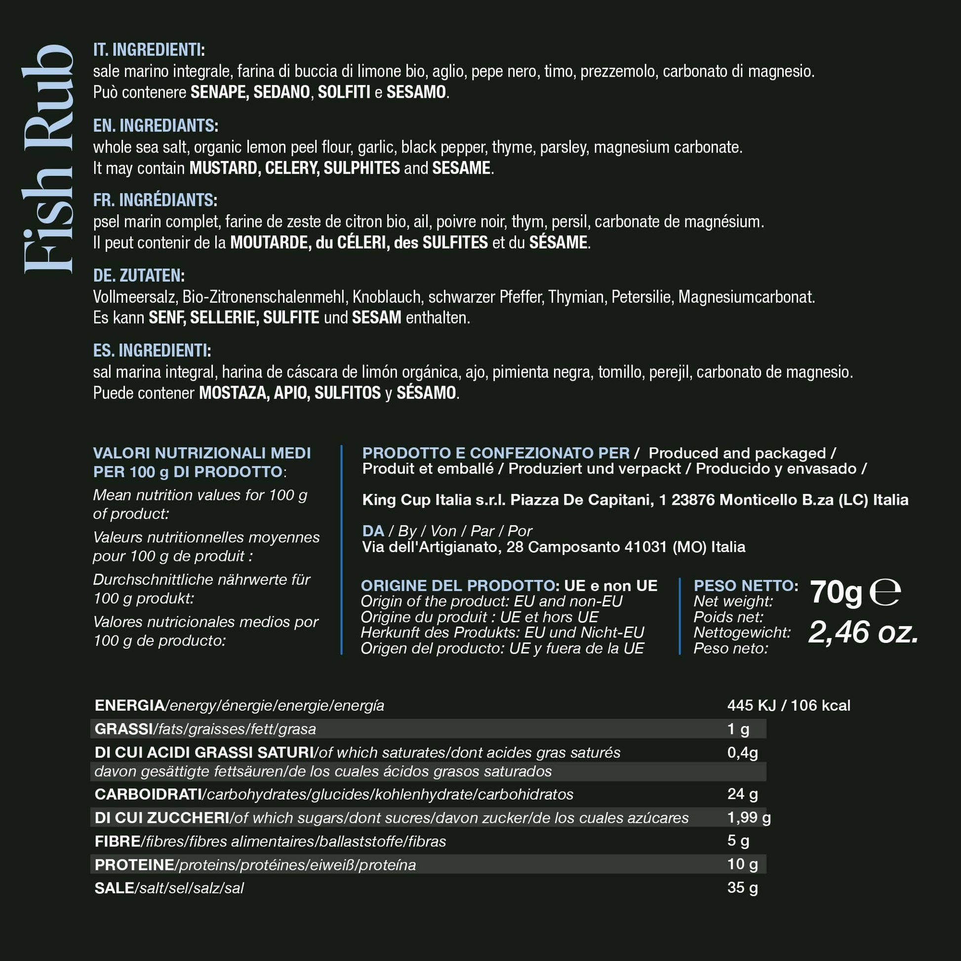 Fish Rub has a very thick texture, also given by ground parsley and salt crystals, and it also has a unique and intense scent.